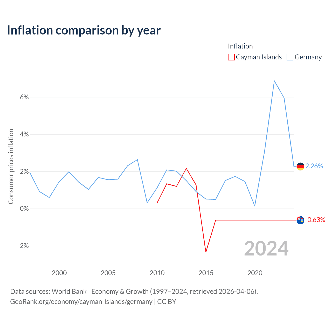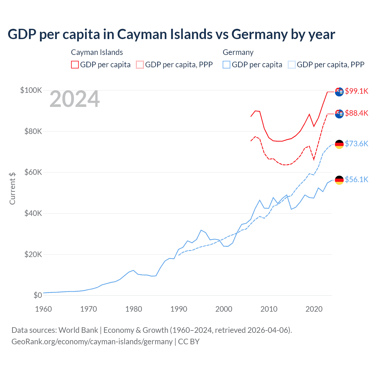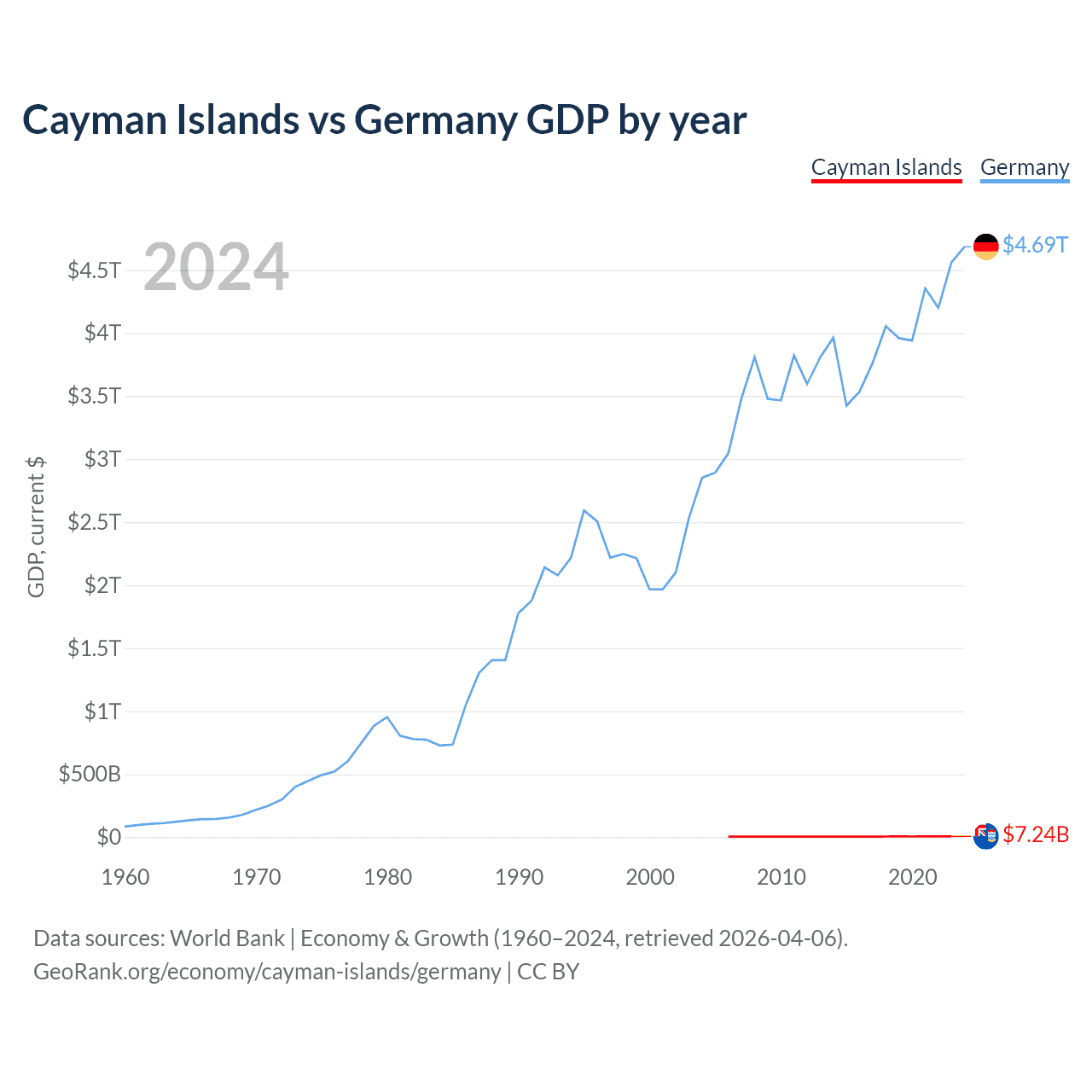 The Cayman Islands has a GDP of $7.24B compared to $4.69T for Germany, ranking 158/197 and 3/197 by economy size, respectively.