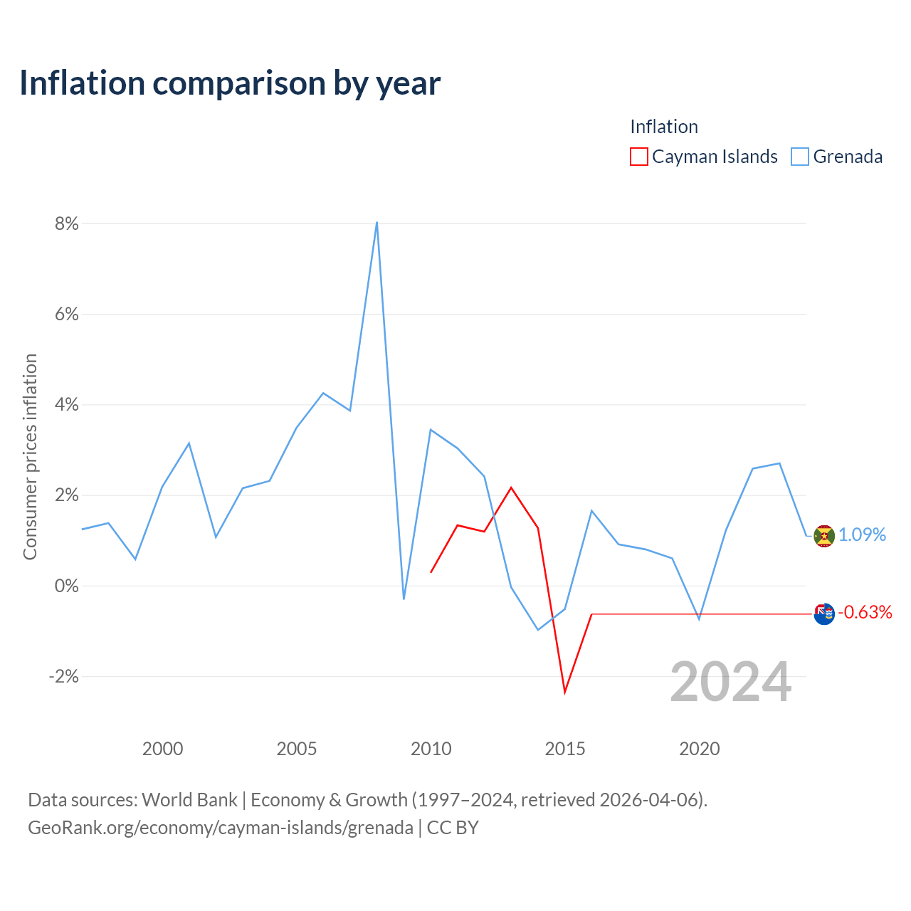 Over the past 7 years, the Cayman Islands has recorded an average annual inflation rate of 0.46%, compared with 1.28% in Grenada. In 2016, inflation was -0.63% in the Cayman Islands and 1.09% in Grenada.