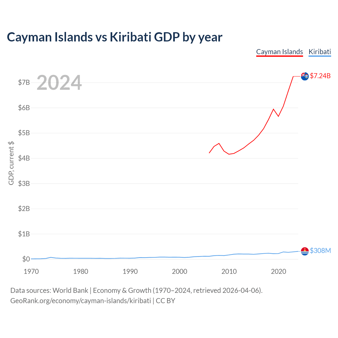 The Cayman Islands has a GDP of $7.24B compared to $308M for Kiribati, ranking 158/197 and 192/197 by economy size, respectively.