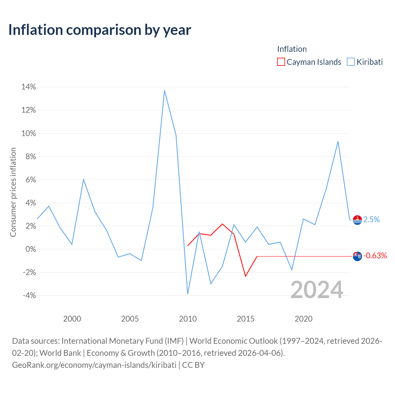 Over the past 7 years, the Cayman Islands has recorded an average annual inflation rate of 0.46%, compared with -0.33% in Kiribati. In 2016, inflation was -0.63% in the Cayman Islands and 2.5% in Kiribati.
