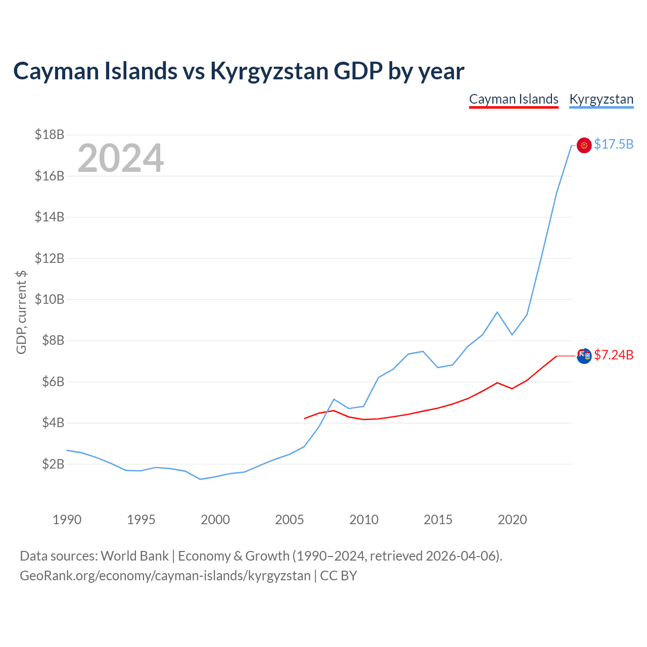 The Cayman Islands has a GDP of $7.24B compared to $17.5B for Kyrgyzstan, ranking 158/197 and 135/197 by economy size, respectively.