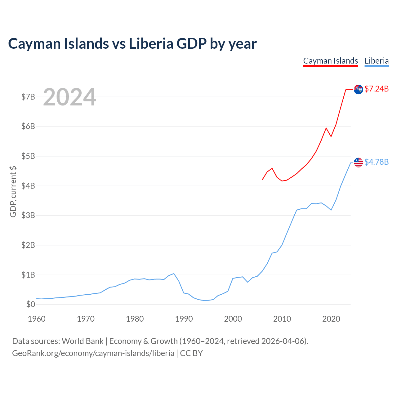 The Cayman Islands has a GDP of $7.24B compared to $4.78B for Liberia, ranking 158/197 and 163/197 by economy size, respectively.