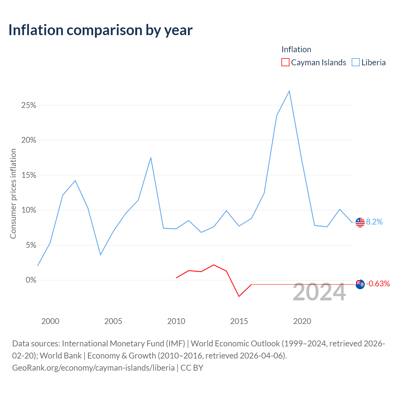 Over the past 7 years, the Cayman Islands has recorded an average annual inflation rate of 0.46%, compared with 8.09% in Liberia. In 2016, inflation was -0.63% in the Cayman Islands and 8.2% in Liberia.
