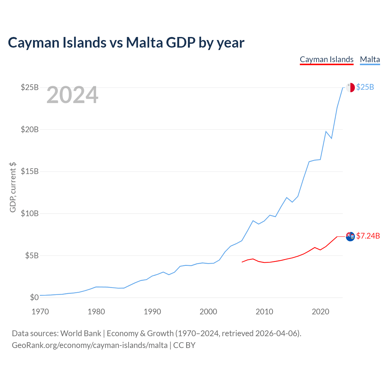 The Cayman Islands has a GDP of $7.24B compared to $25B for Malta, ranking 158/197 and 119/197 by economy size, respectively.