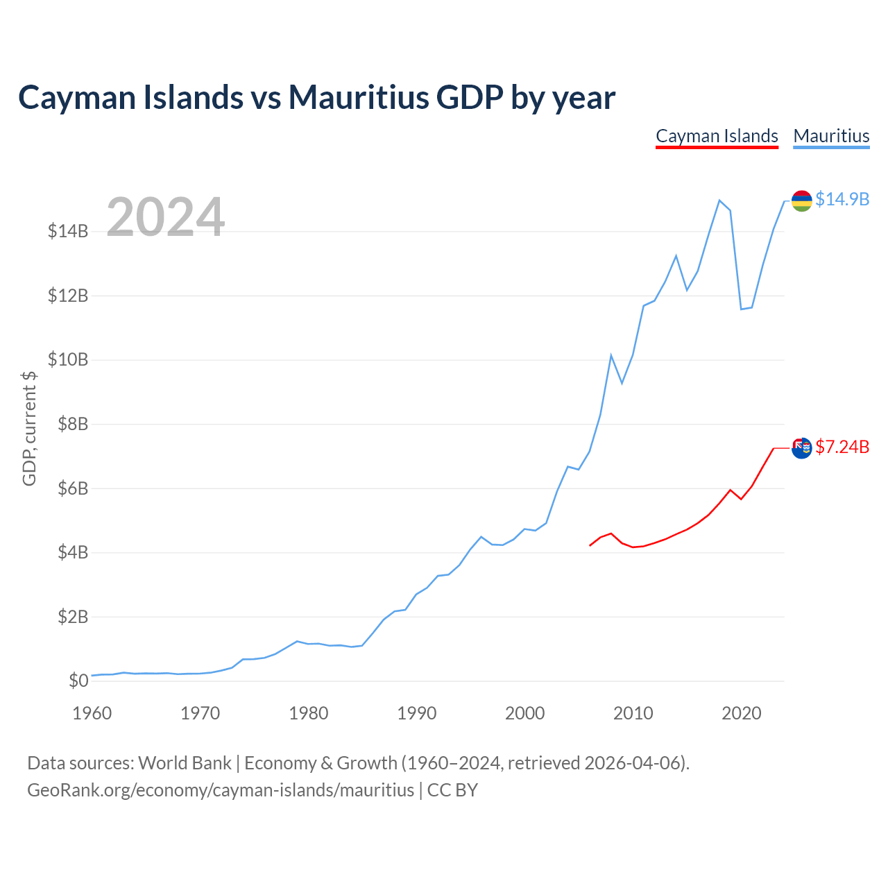 Cayman Islands vs Mauritius GDP by year