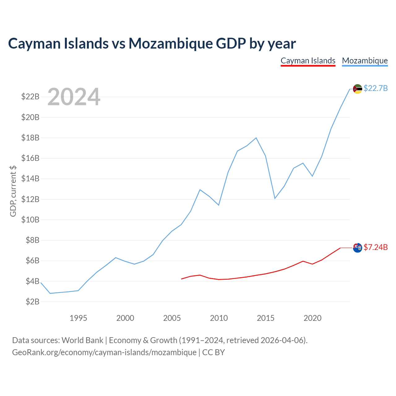 The Cayman Islands has a GDP of $7.24B compared to $22.7B for Mozambique, ranking 158/197 and 123/197 by economy size, respectively.