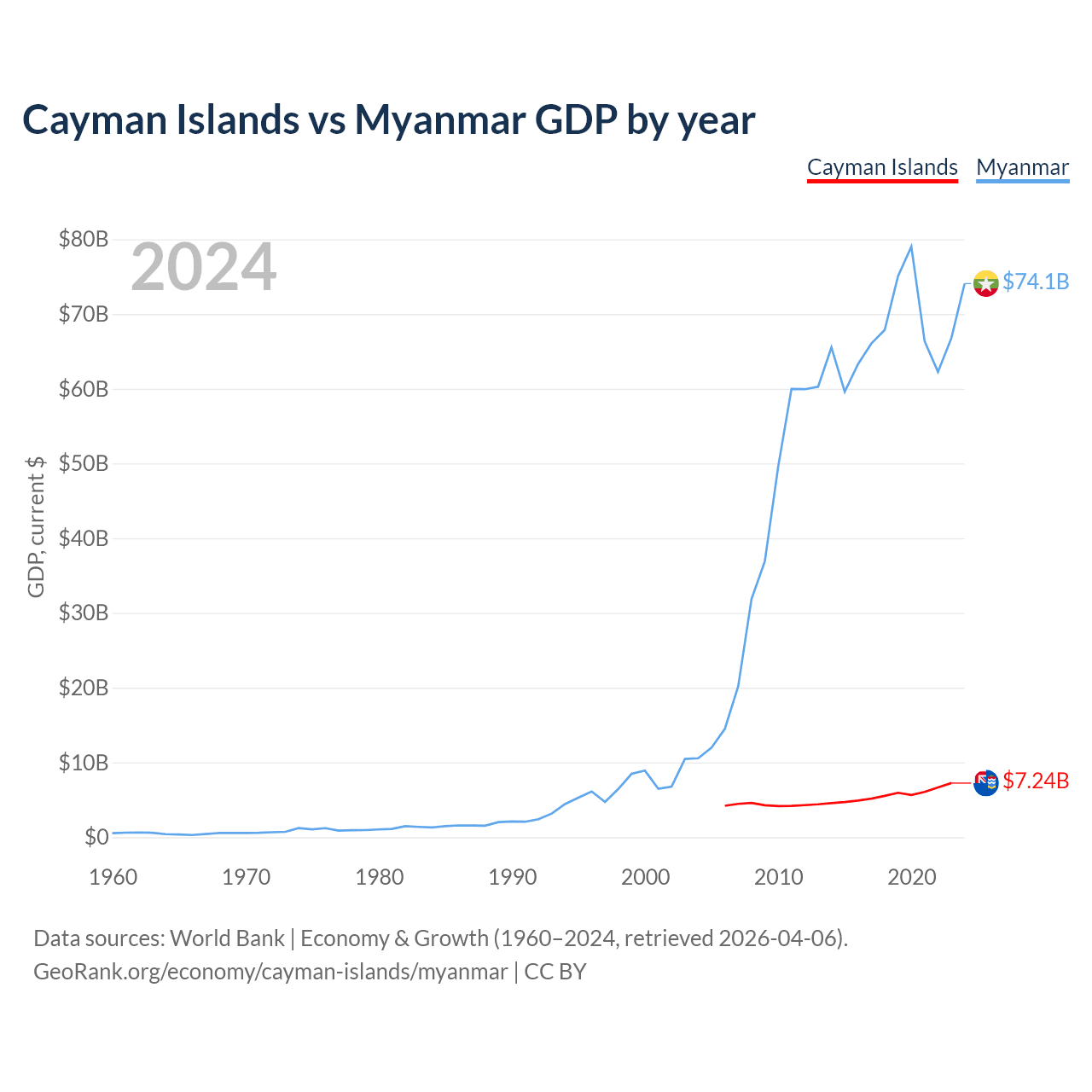 The Cayman Islands has a GDP of $7.24B compared to $74.1B for Myanmar, ranking 158/197 and 85/197 by economy size, respectively.