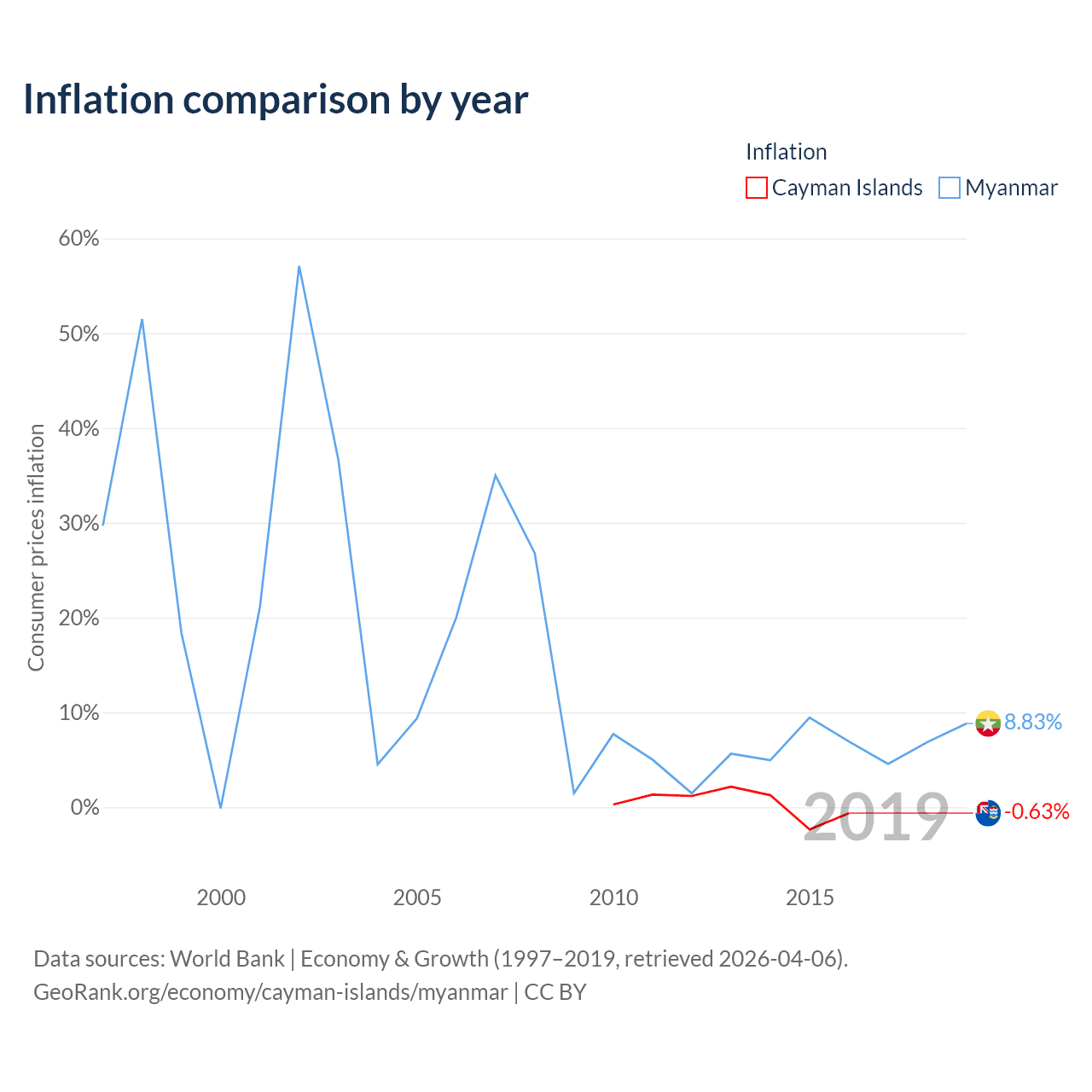 Over the past 7 years, the Cayman Islands has recorded an average annual inflation rate of 0.46%, compared with 5.88% in Myanmar. In 2016, inflation was -0.63% in the Cayman Islands and 8.83% in Myanmar.