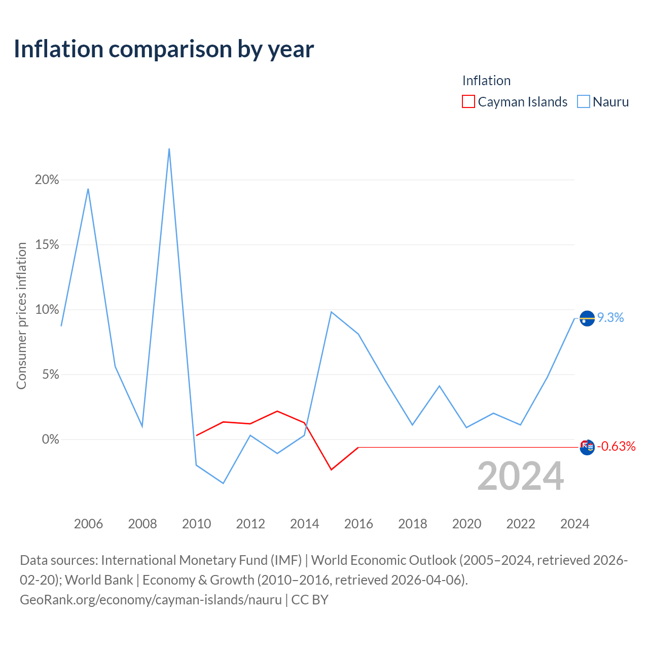 Over the past 7 years, the Cayman Islands has recorded an average annual inflation rate of 0.46%, compared with 1.71% in Nauru. In 2016, inflation was -0.63% in the Cayman Islands and 9.3% in Nauru.