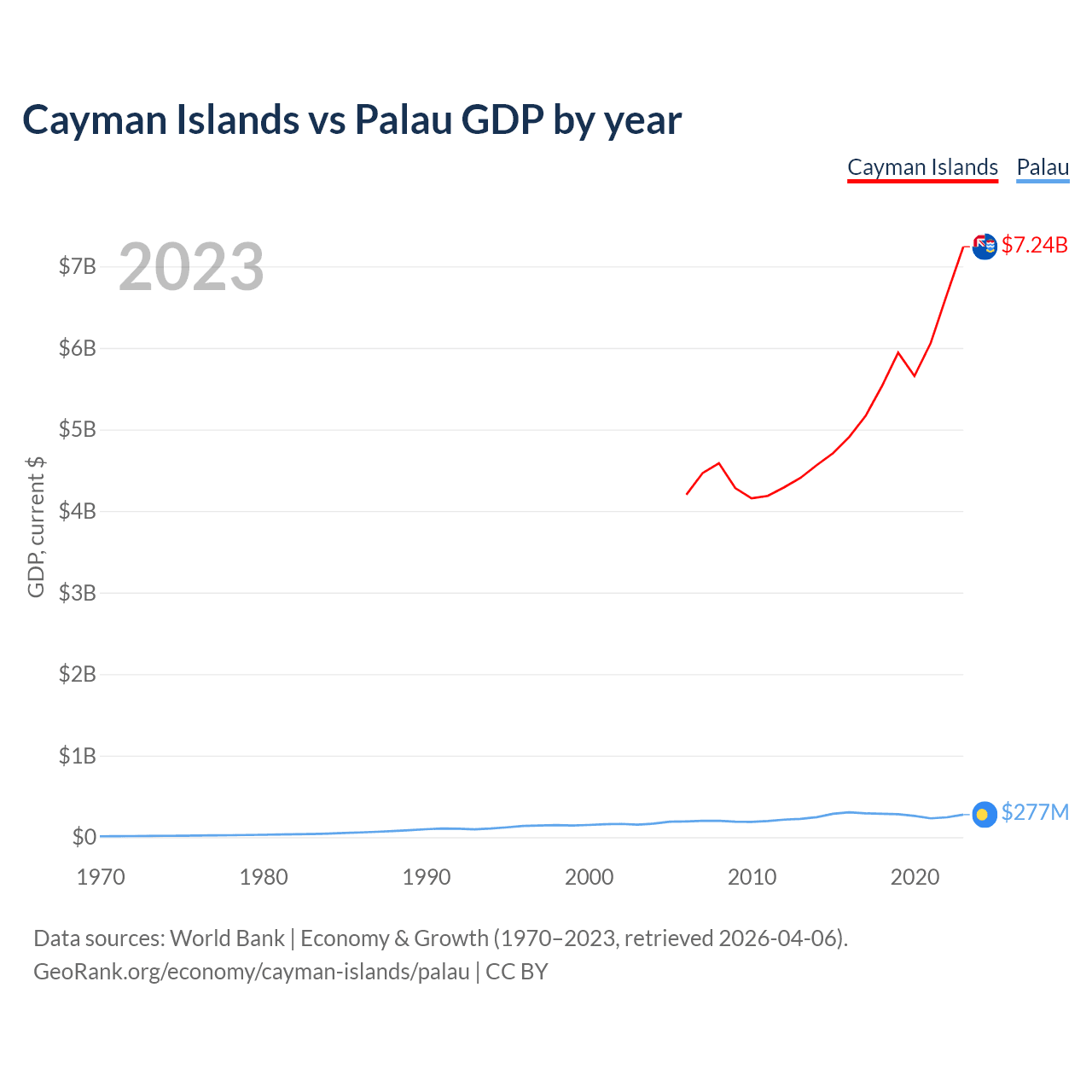 The Cayman Islands has a GDP of $7.24B compared to $277M for Palau, ranking 158/197 and 194/197 by economy size, respectively.