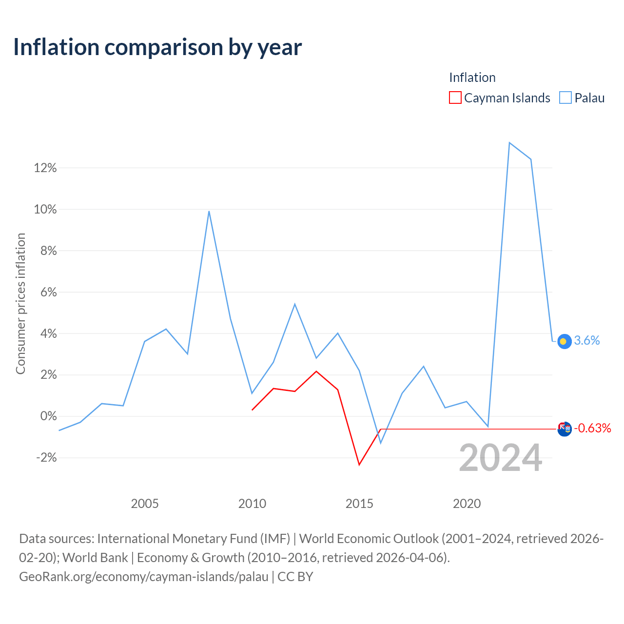 Over the past 7 years, the Cayman Islands has recorded an average annual inflation rate of 0.46%, compared with 2.4% in Palau. In 2016, inflation was -0.63% in the Cayman Islands and 3.6% in Palau.
