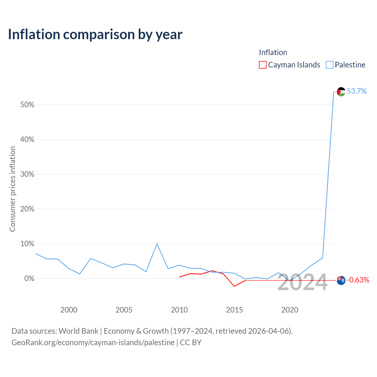 Over the past 7 years, the Cayman Islands has recorded an average annual inflation rate of 0.46%, compared with 2.01% in Palestine. In 2016, inflation was -0.63% in the Cayman Islands and 53.7% in Palestine.