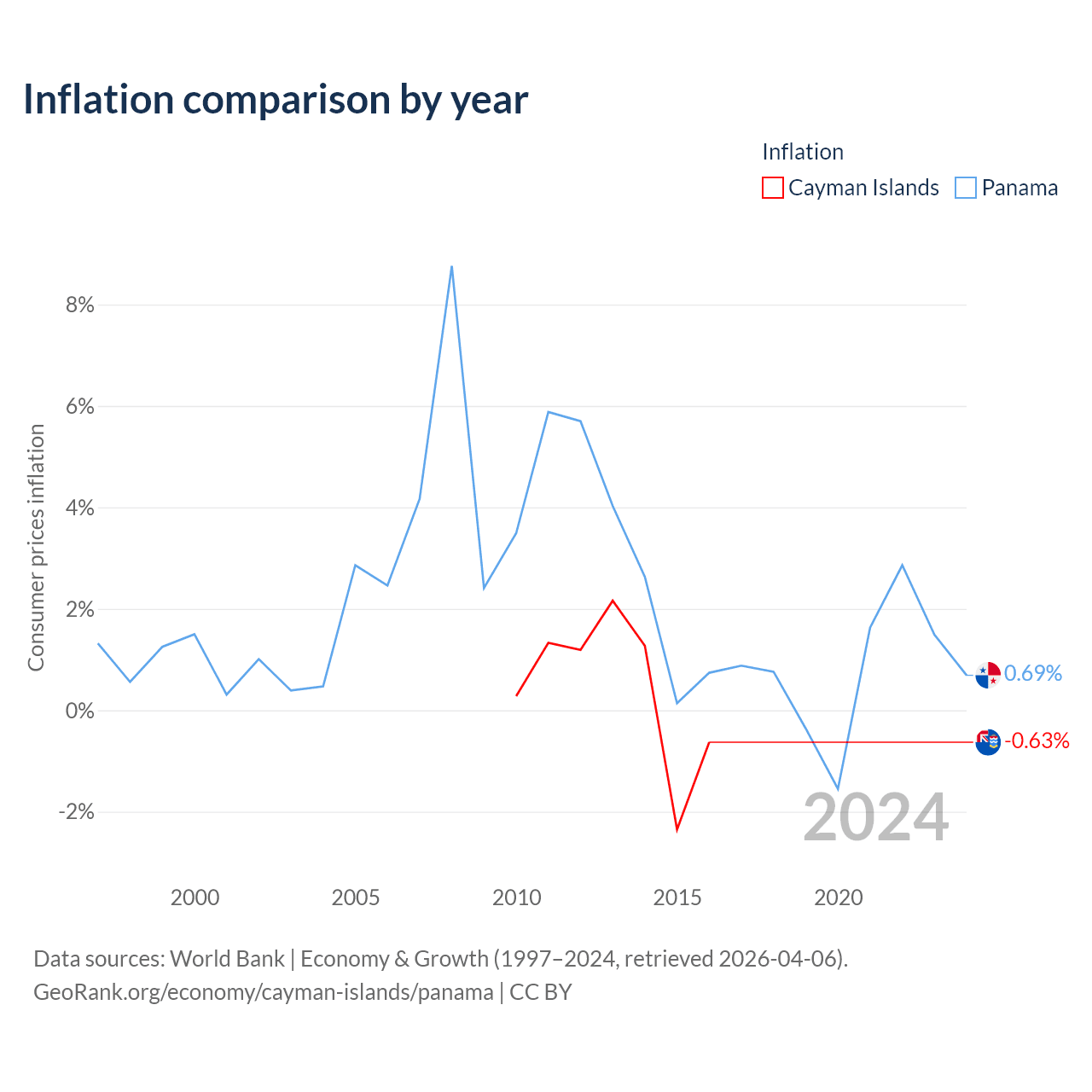 Over the past 7 years, the Cayman Islands has recorded an average annual inflation rate of 0.46%, compared with 3.23% in Panama. In 2016, inflation was -0.63% in the Cayman Islands and 0.69% in Panama.