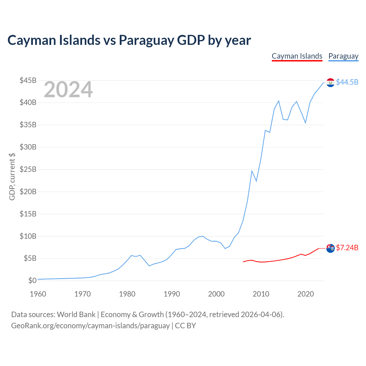The Cayman Islands has a GDP of $7.24B compared to $44.5B for Paraguay, ranking 158/197 and 98/197 by economy size, respectively.