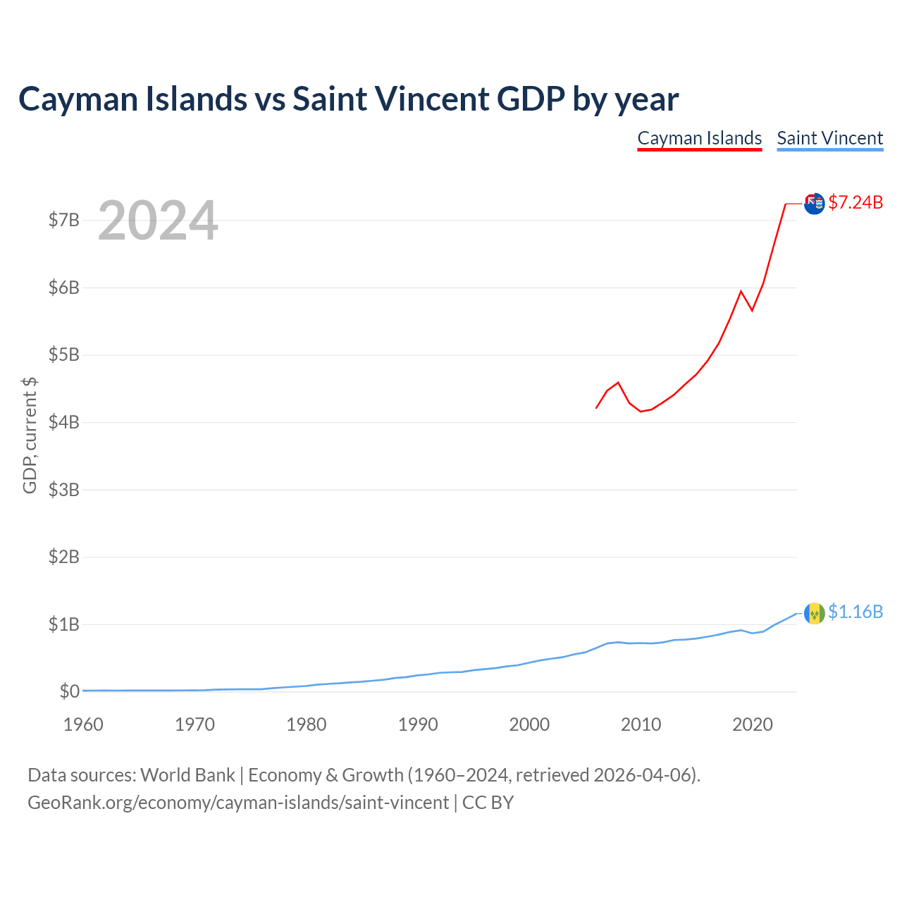 The Cayman Islands has a GDP of $7.24B compared to $1.16B for Saint Vincent, ranking 158/197 and 186/197 by economy size, respectively.