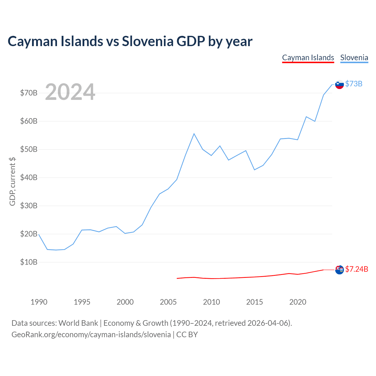 The Cayman Islands has a GDP of $7.24B compared to $73B for Slovenia, ranking 158/197 and 86/197 by economy size, respectively.