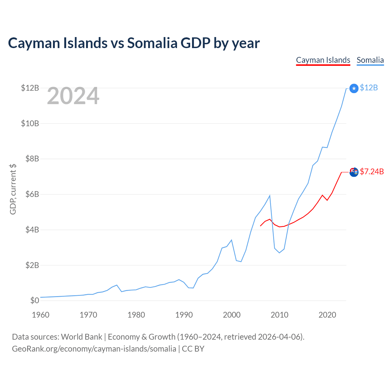 The Cayman Islands has a GDP of $7.24B compared to $12B for Somalia, ranking 158/197 and 150/197 by economy size, respectively.