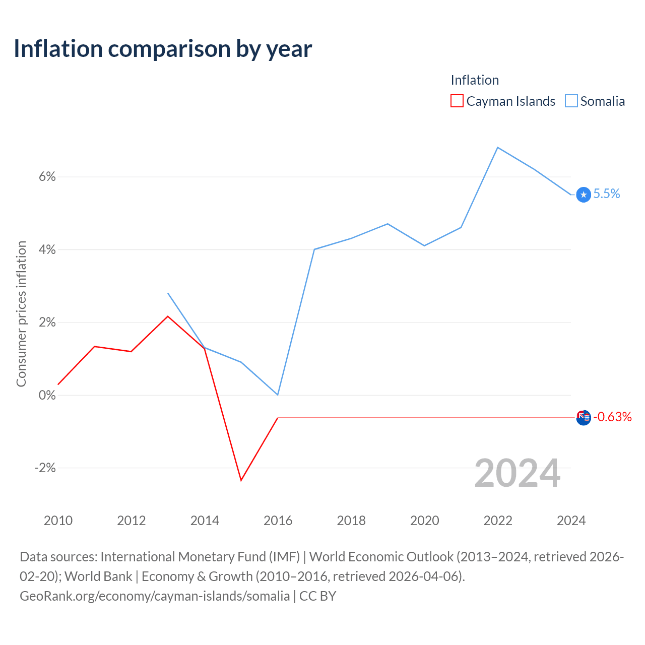 Over the past 4 years, the Cayman Islands has recorded an average annual inflation rate of 0.12%, compared with 1.25% in Somalia. In 2016, inflation was -0.63% in the Cayman Islands and 5.5% in Somalia.