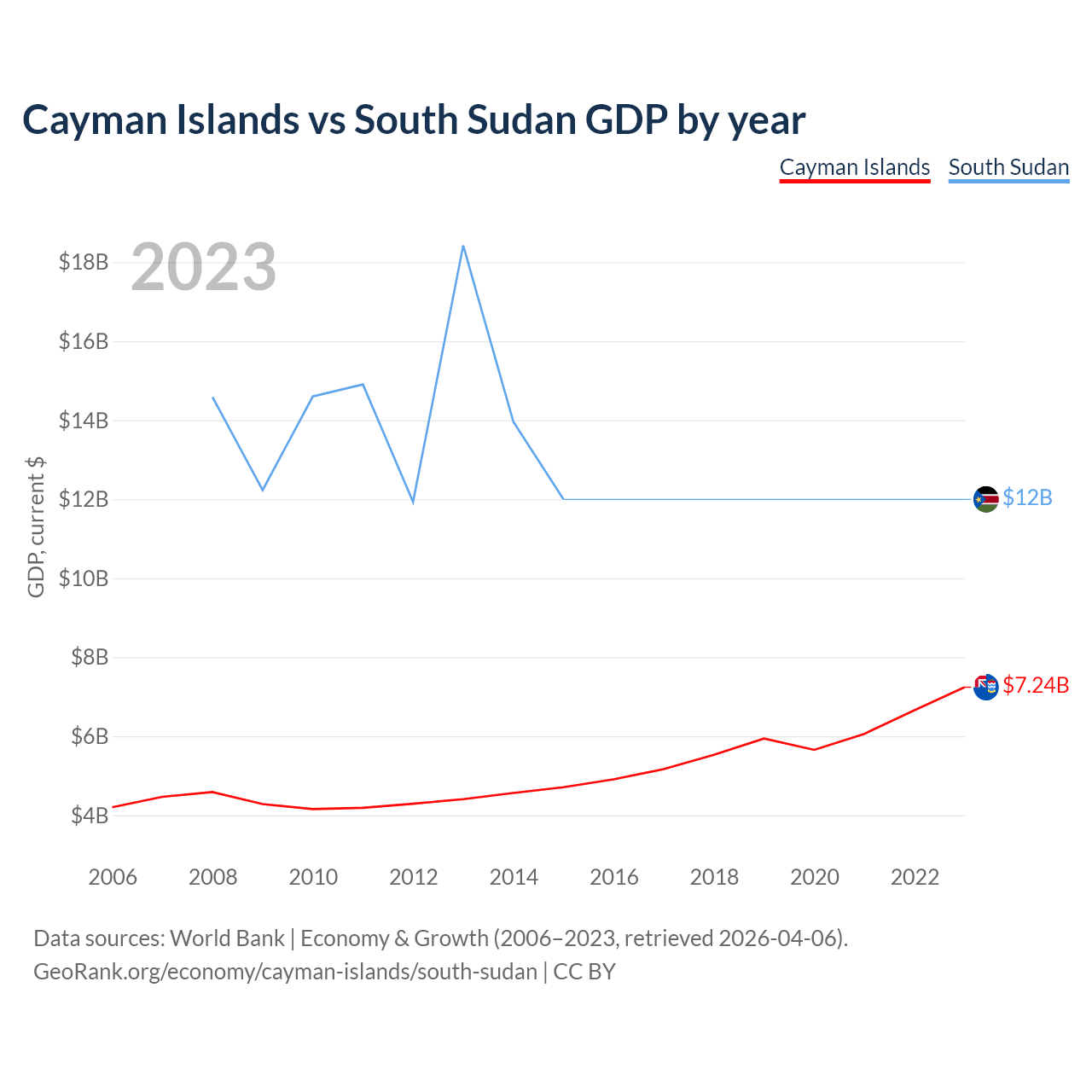 The Cayman Islands has a GDP of $7.24B compared to $12B for South Sudan, ranking 158/197 and 149/197 by economy size, respectively.