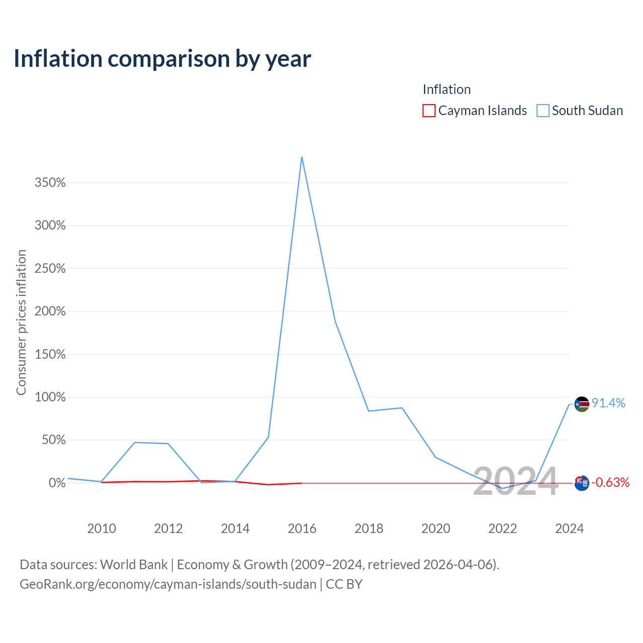Over the past 7 years, the Cayman Islands has recorded an average annual inflation rate of 0.46%, compared with 75.4% in South Sudan. In 2016, inflation was -0.63% in the Cayman Islands and 91.4% in South Sudan.