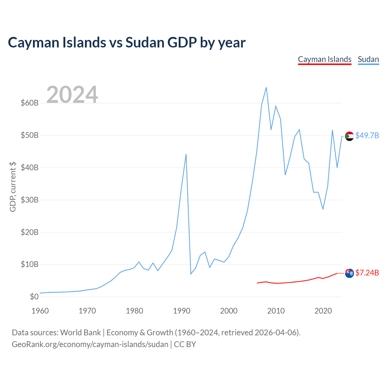 The Cayman Islands has a GDP of $7.24B compared to $49.7B for Sudan, ranking 158/197 and 94/197 by economy size, respectively.