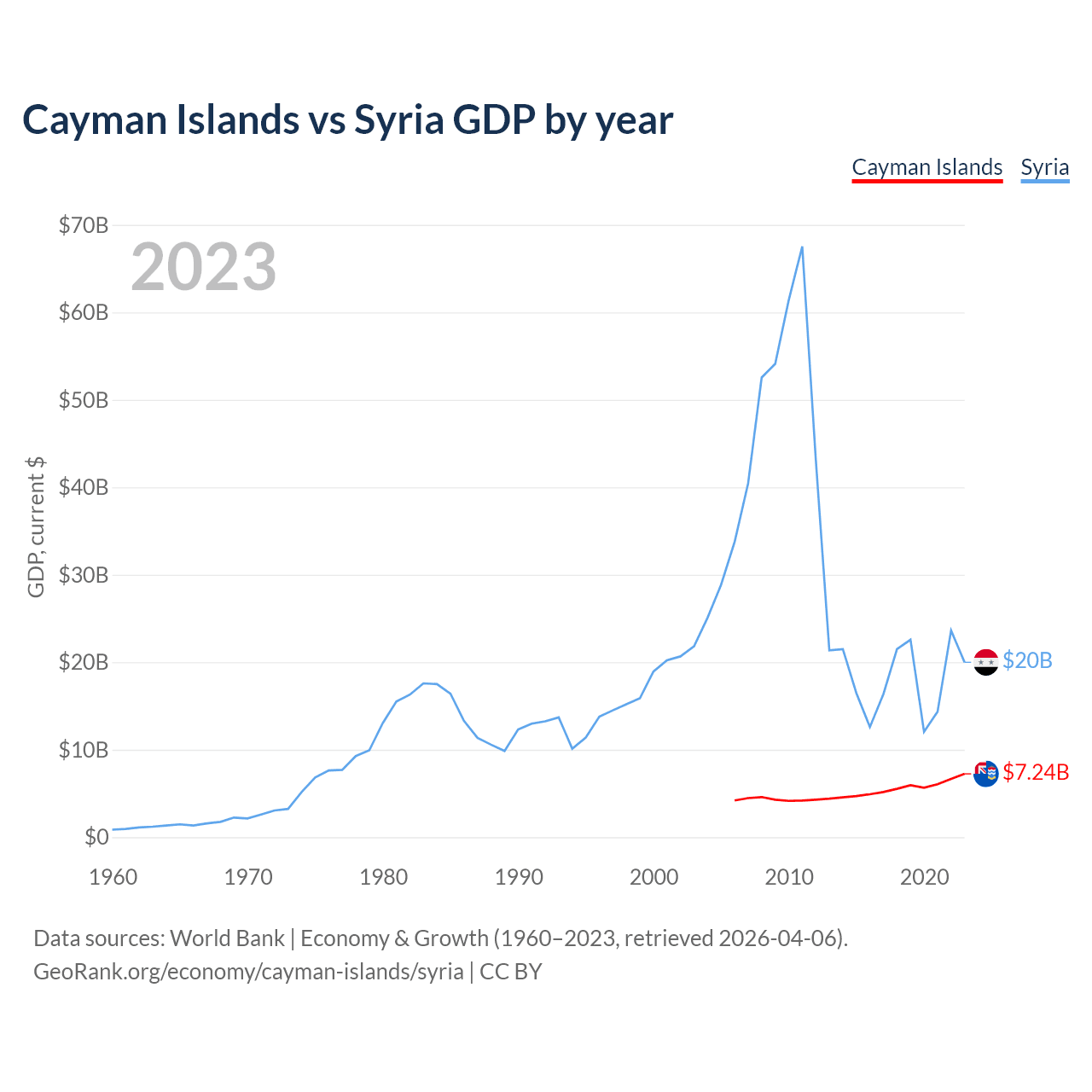 The Cayman Islands has a GDP of $7.24B compared to $20B for Syria, ranking 158/197 and 129/197 by economy size, respectively.