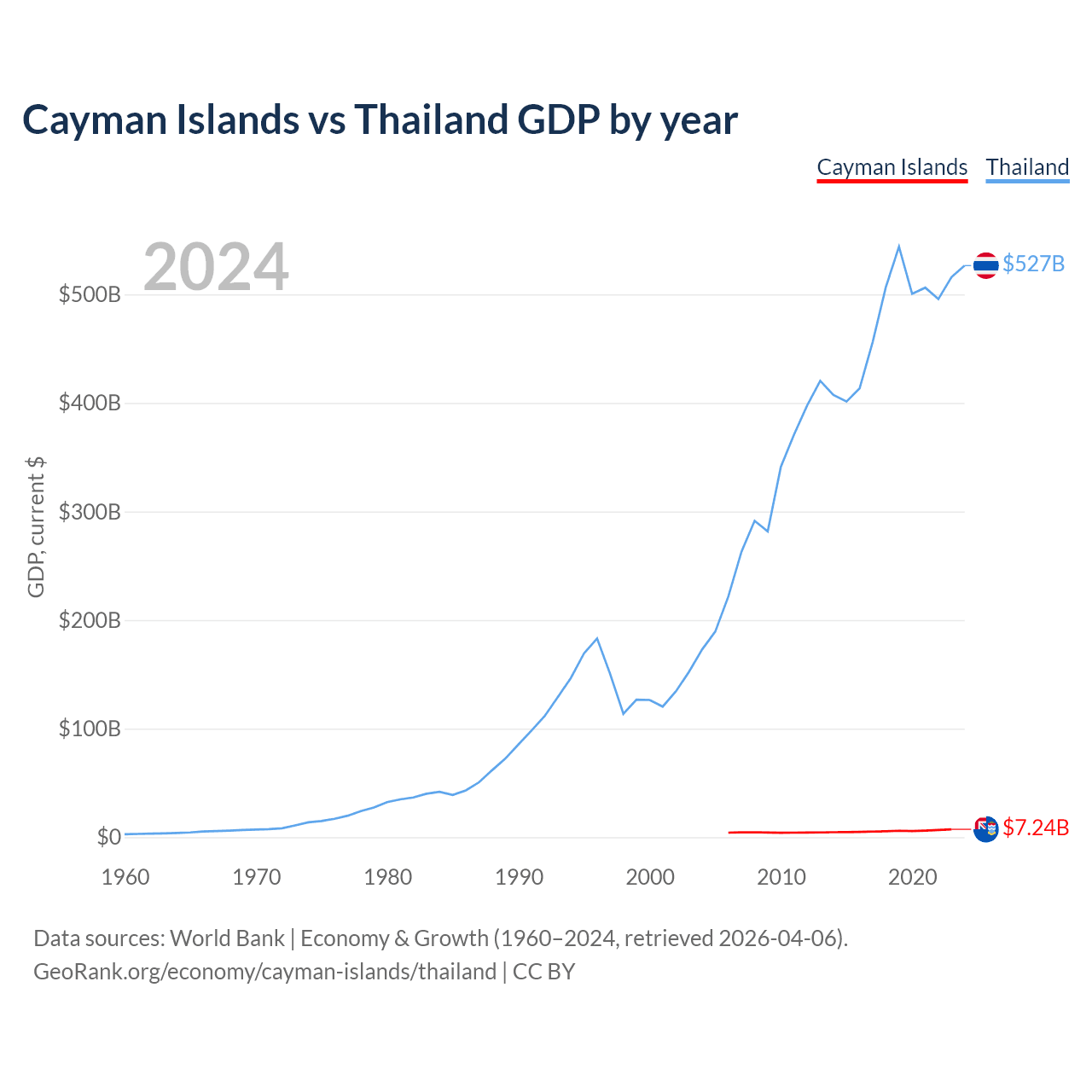 The Cayman Islands has a GDP of $7.24B compared to $527B for Thailand, ranking 158/197 and 31/197 by economy size, respectively.