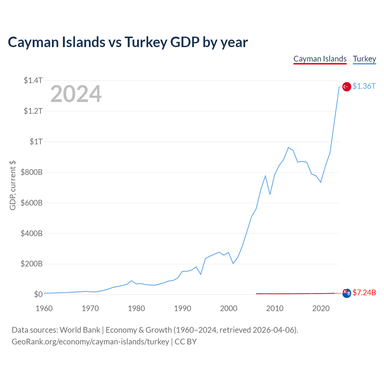 The Cayman Islands has a GDP of $7.24B compared to $1.36T for Turkey, ranking 158/197 and 17/197 by economy size, respectively.