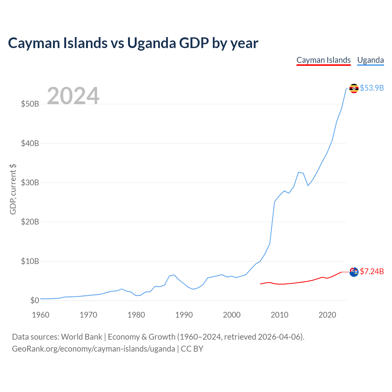 The Cayman Islands has a GDP of $7.24B compared to $53.9B for Uganda, ranking 158/197 and 89/197 by economy size, respectively.