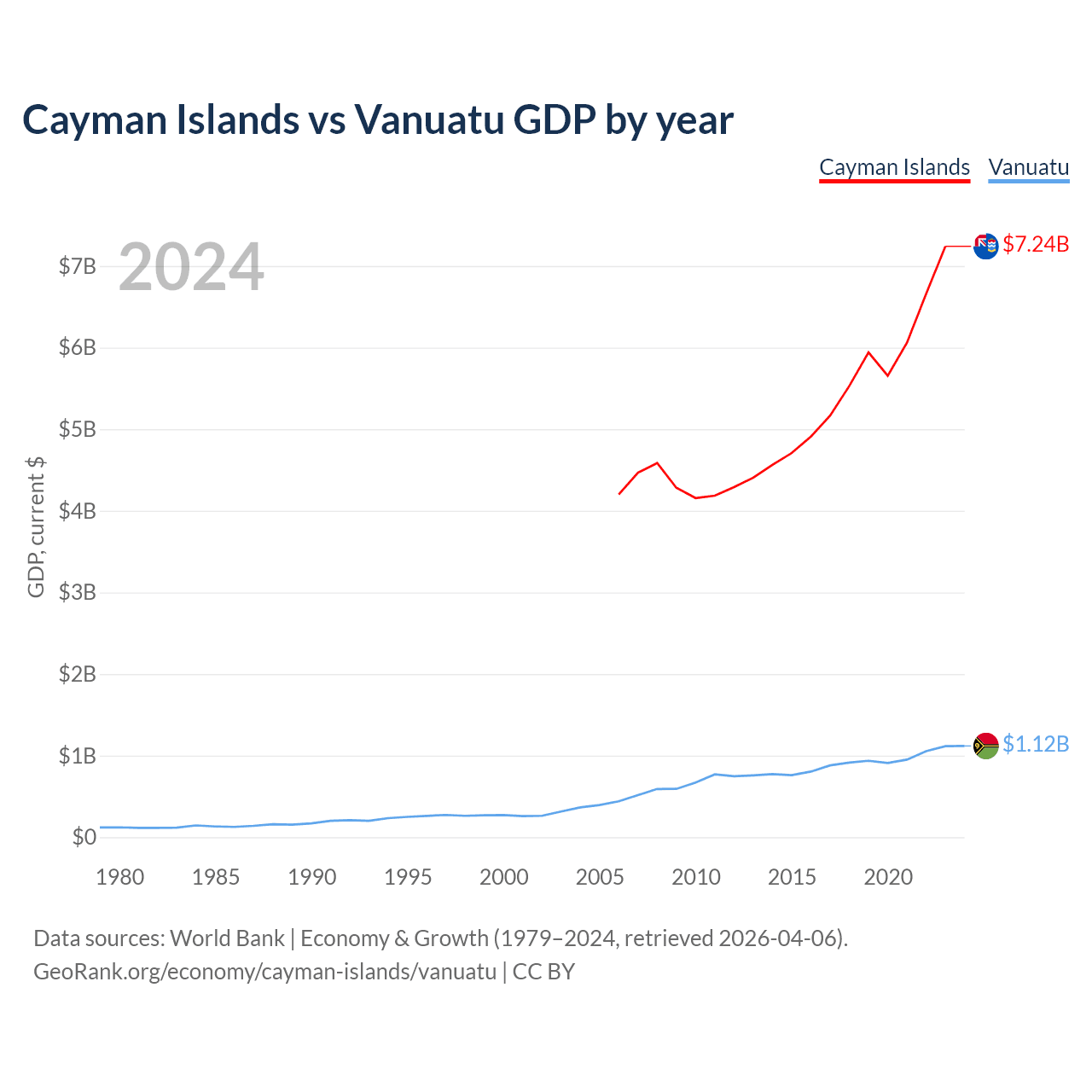The Cayman Islands has a GDP of $7.24B compared to $1.12B for Vanuatu, ranking 158/197 and 188/197 by economy size, respectively.