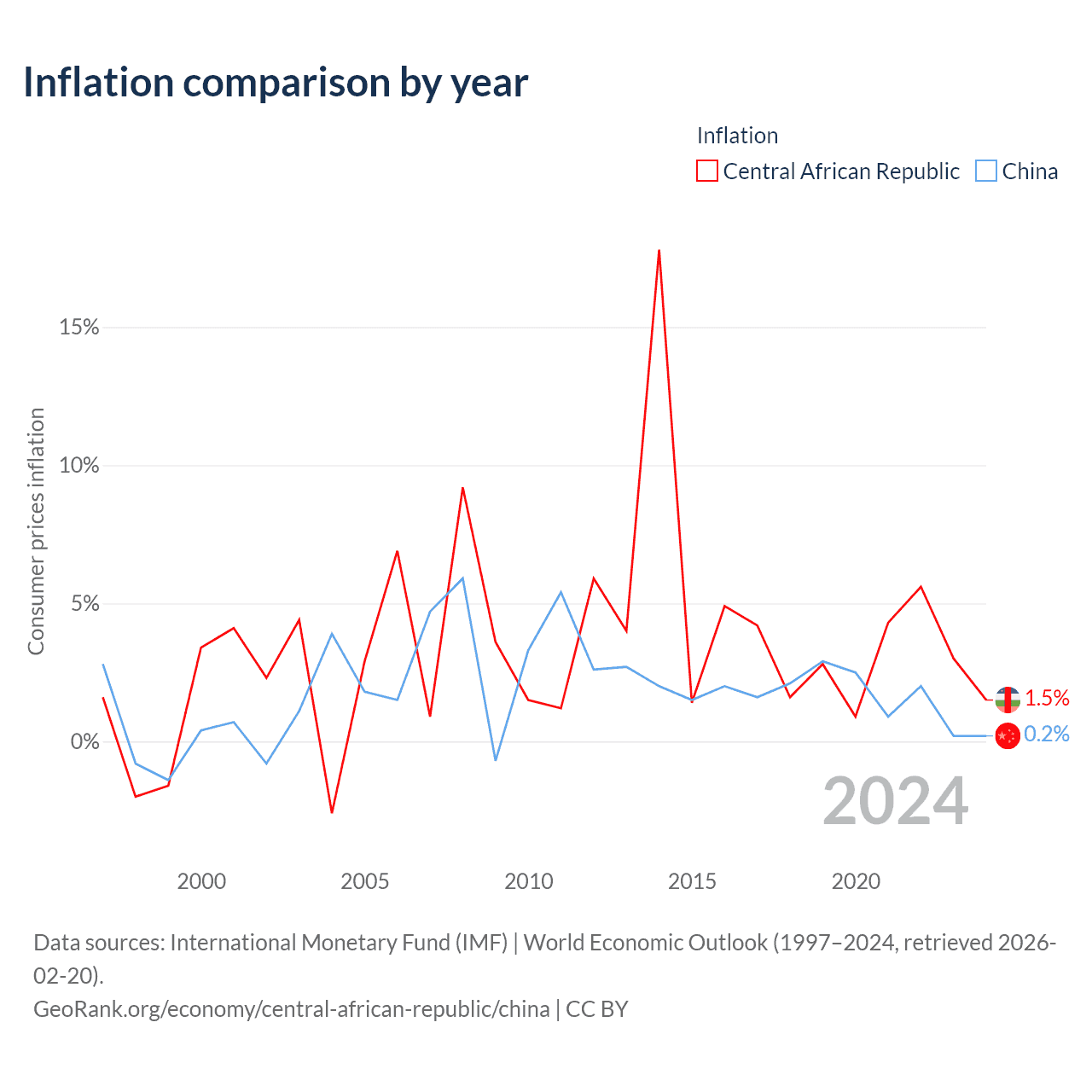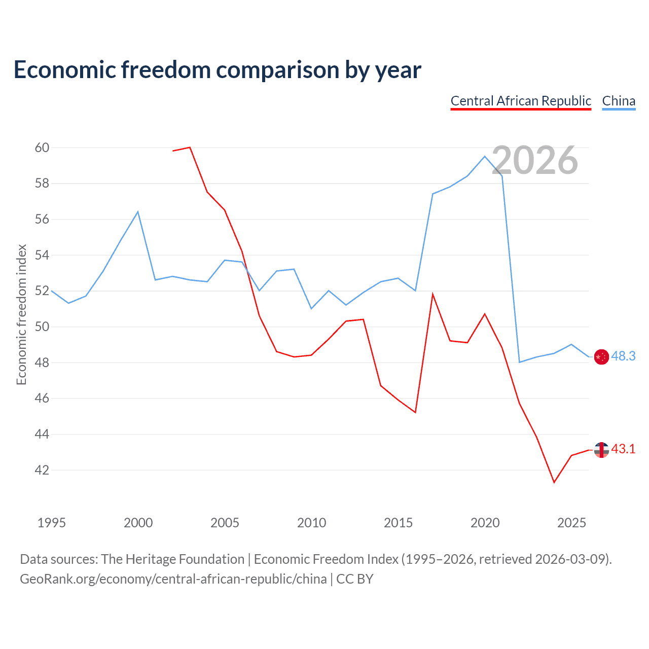 The Economic Freedom Index for the Central African Republic is 43.1, ranking 182/197, compared to 48.3 for China, ranking 170/197. The chart above displays a comparison of annual changes in economic freedom indexes.