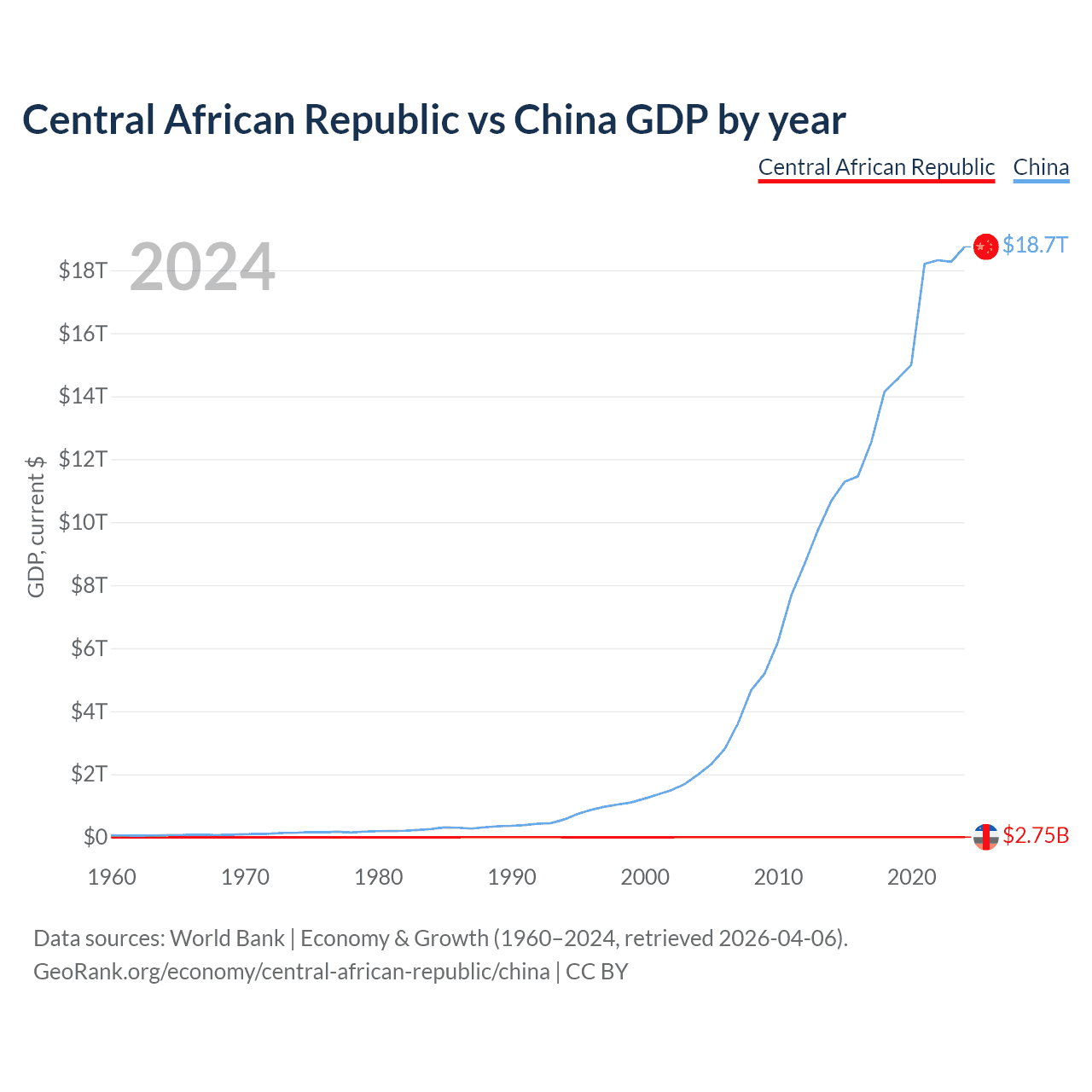 The Central African Republic has a GDP of $2.75B compared to $18.7T for China, ranking 171/197 and 2/197 by economy size, respectively.