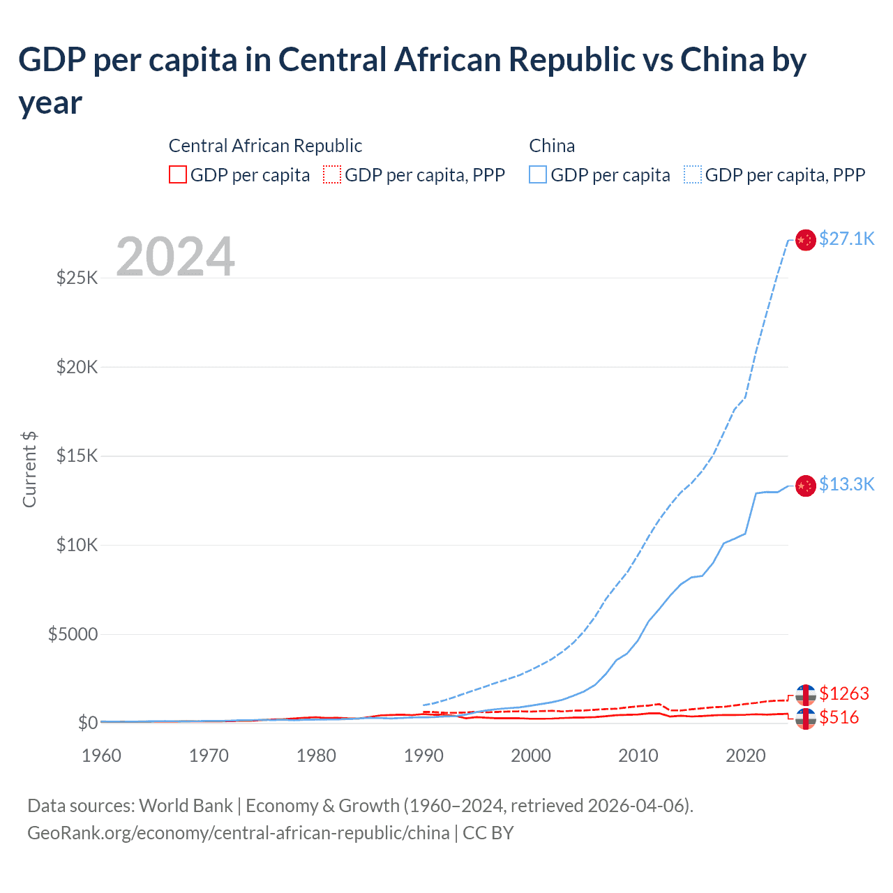 GDP per capita in Central African Republic vs China by year