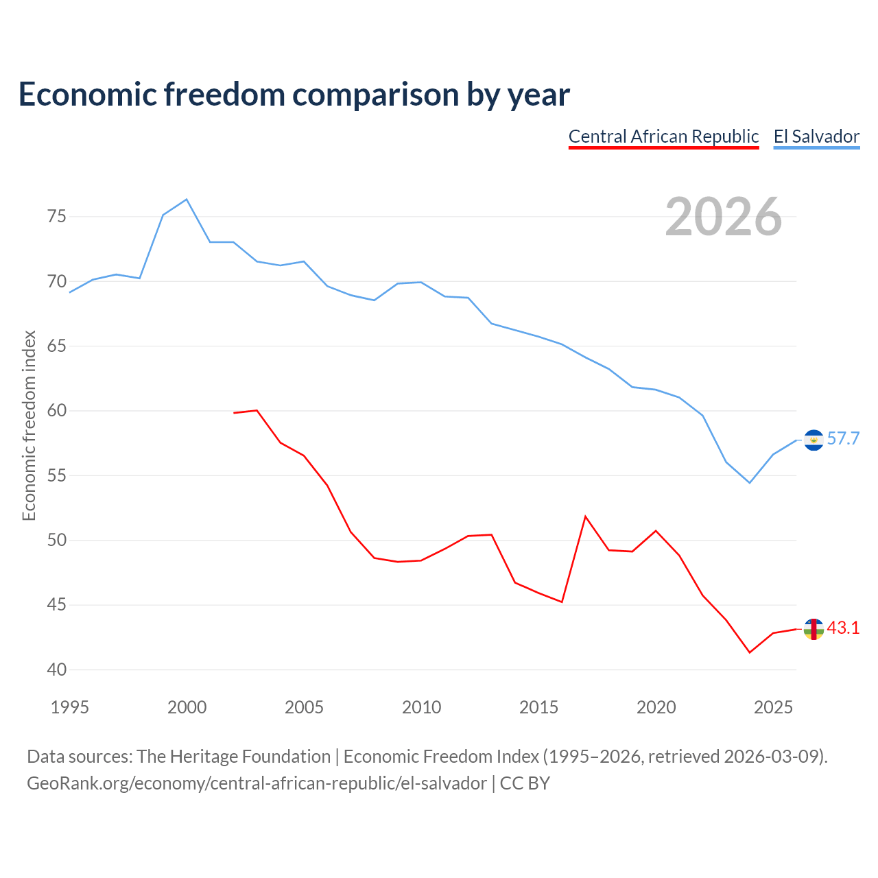 The Economic Freedom Index for the Central African Republic is 43.1, ranking 182/197, compared to 57.7 for El Salvador, ranking 114/197. The chart above displays a comparison of annual changes in economic freedom indexes.