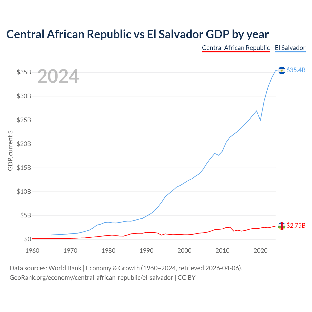 The Central African Republic has a GDP of $2.75B compared to $35.4B for El Salvador, ranking 171/197 and 105/197 by economy size, respectively.