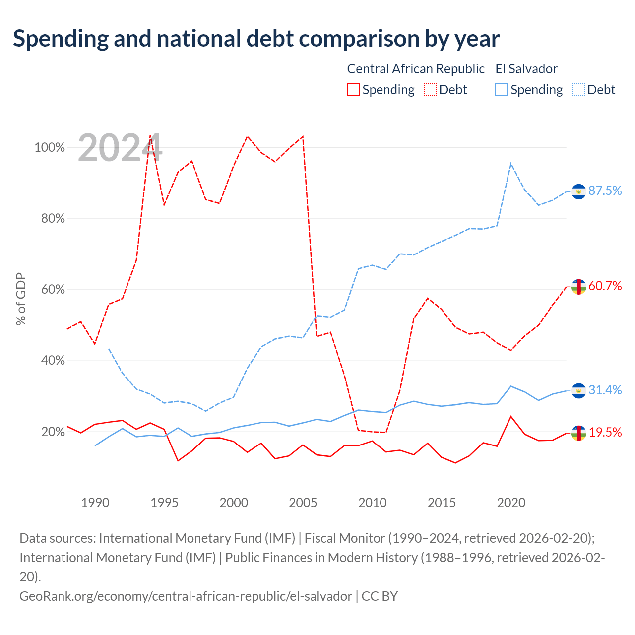 The Central African Republic has $1.67B in government debt (60.7% of GDP), compared to $30.9B (87.5% of GDP) in El Salvador.
