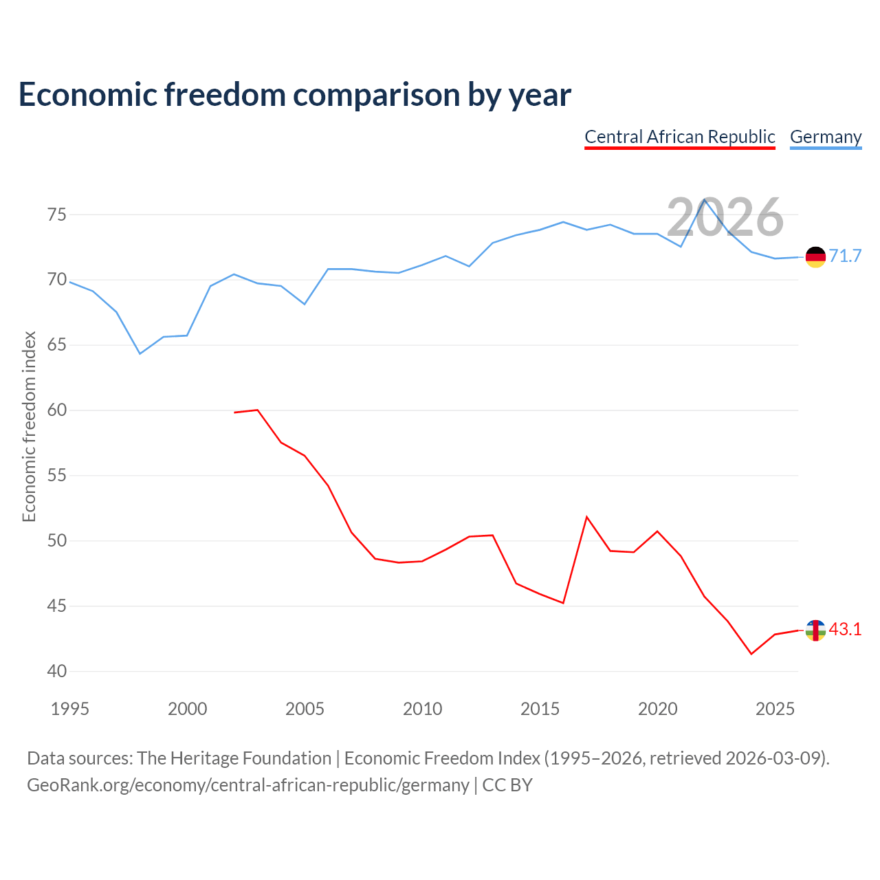 The Economic Freedom Index for the Central African Republic is 43.1, ranking 182/197, compared to 71.7 for Germany, ranking 30/197. The chart above displays a comparison of annual changes in economic freedom indexes.