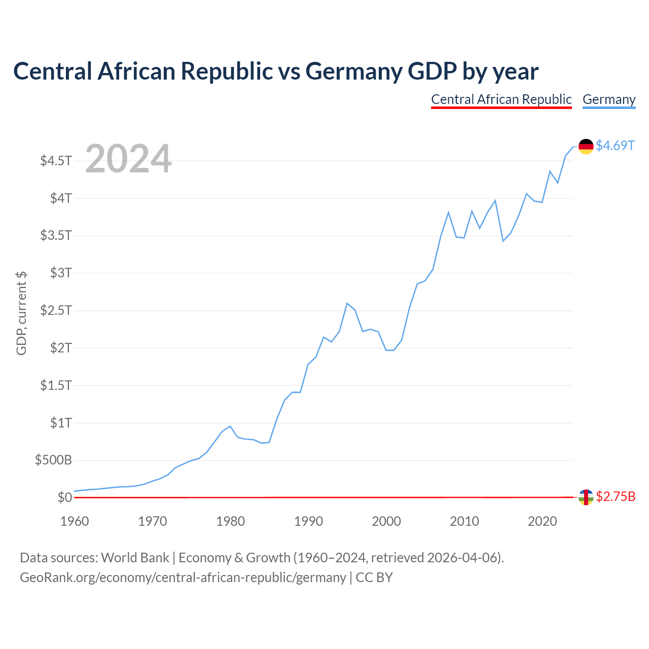 The Central African Republic has a GDP of $2.75B compared to $4.69T for Germany, ranking 171/197 and 3/197 by economy size, respectively.