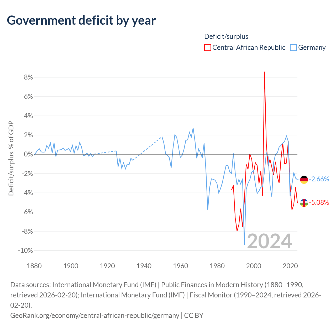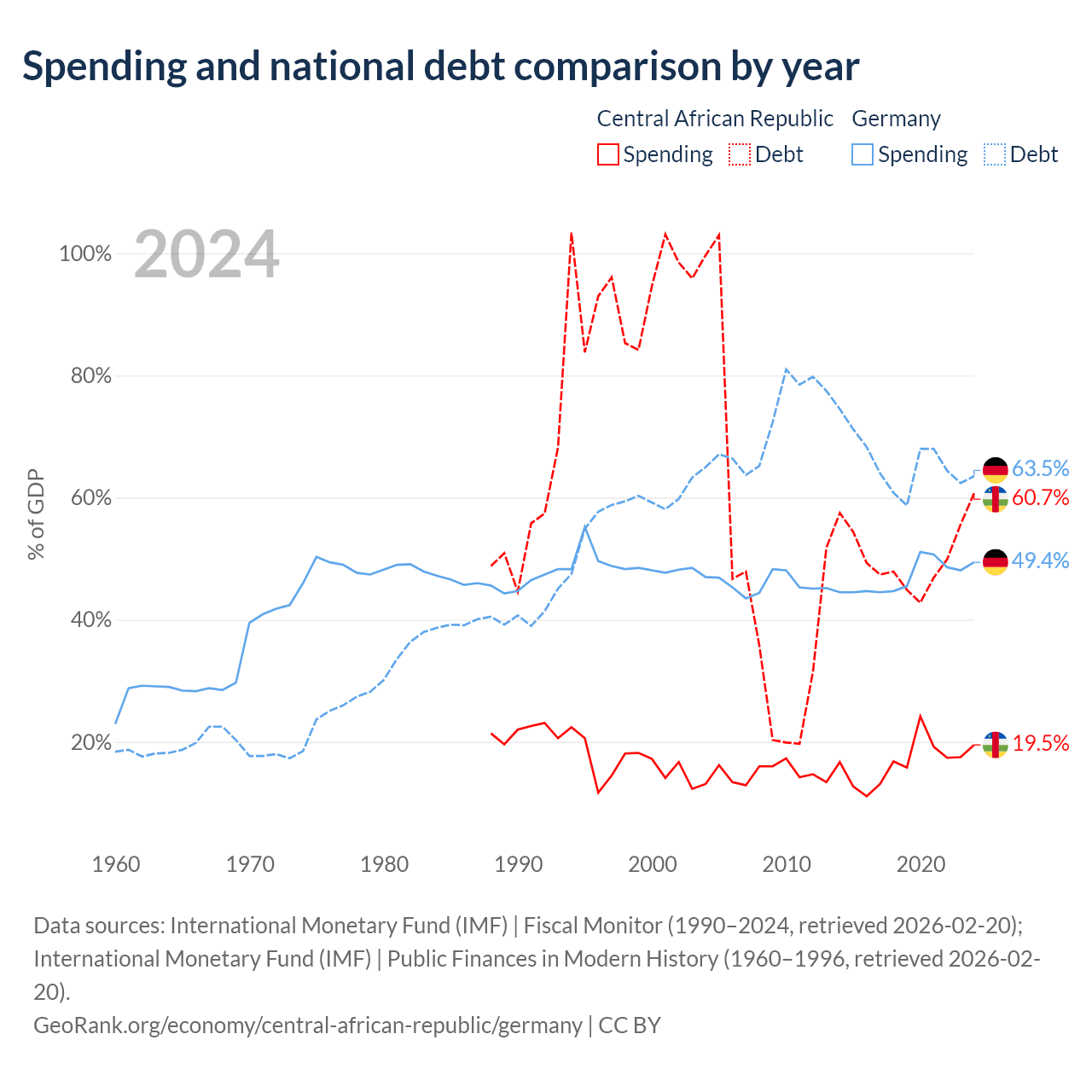The Central African Republic has $1.67B in government debt (60.7% of GDP), compared to $2.97T (63.5% of GDP) in Germany.