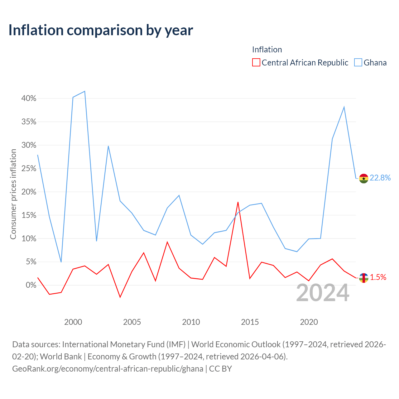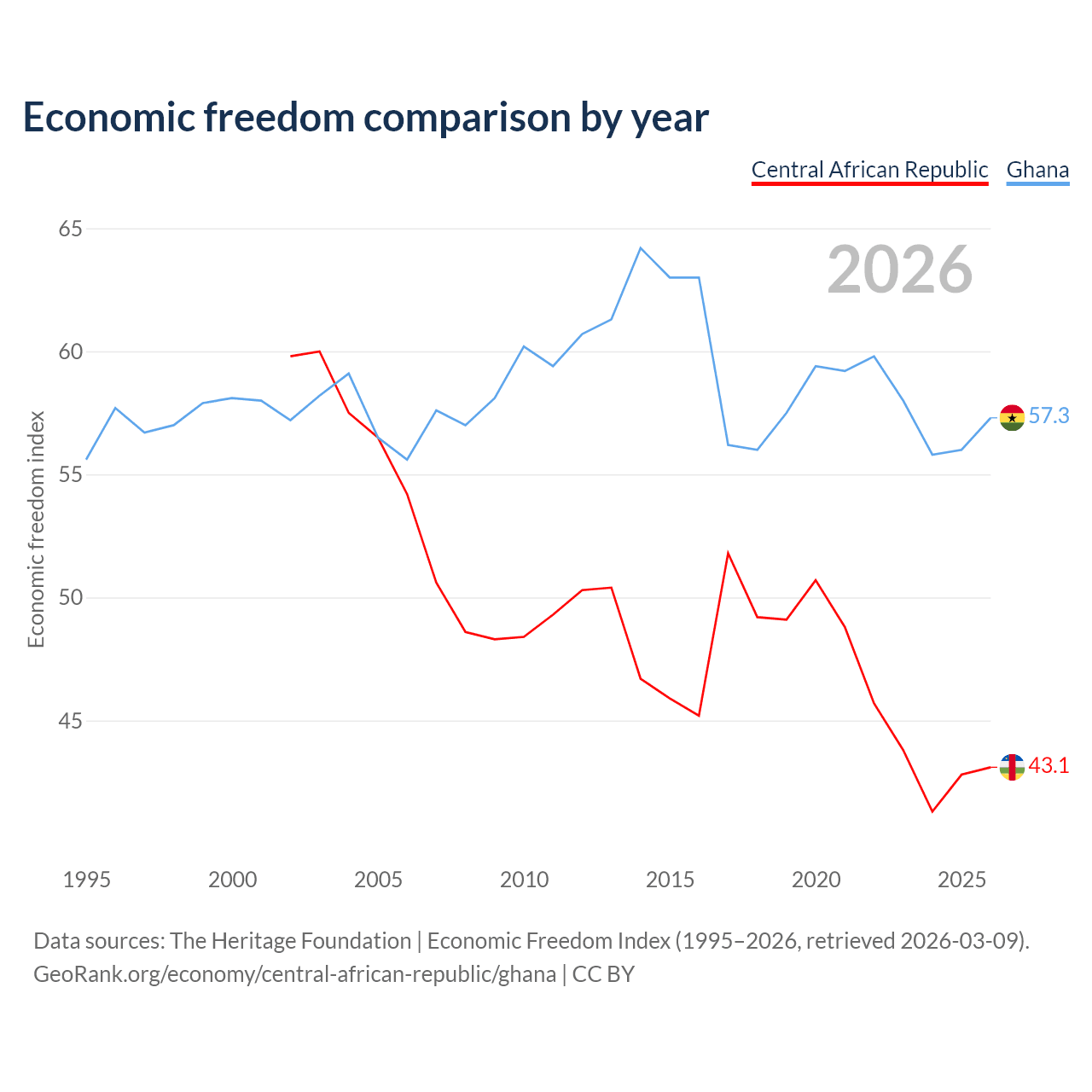 The Economic Freedom Index for the Central African Republic is 43.1, ranking 182/197, compared to 57.3 for Ghana, ranking 118/197. The chart above displays a comparison of annual changes in economic freedom indexes.