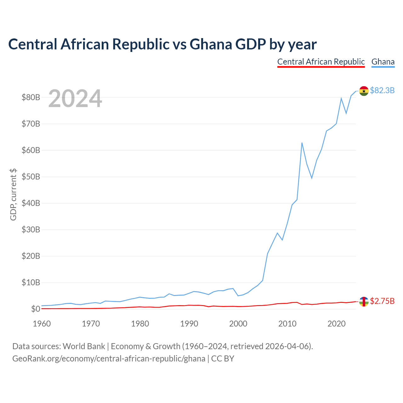 The Central African Republic has a GDP of $2.75B compared to $82.3B for Ghana, ranking 171/197 and 80/197 by economy size, respectively.