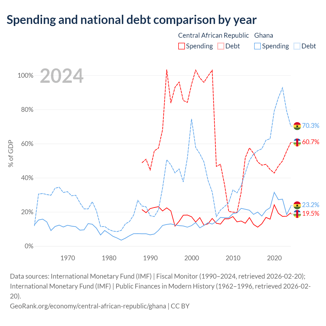 The Central African Republic has $1.67B in government debt (60.7% of GDP), compared to $57.9B (70.3% of GDP) in Ghana.