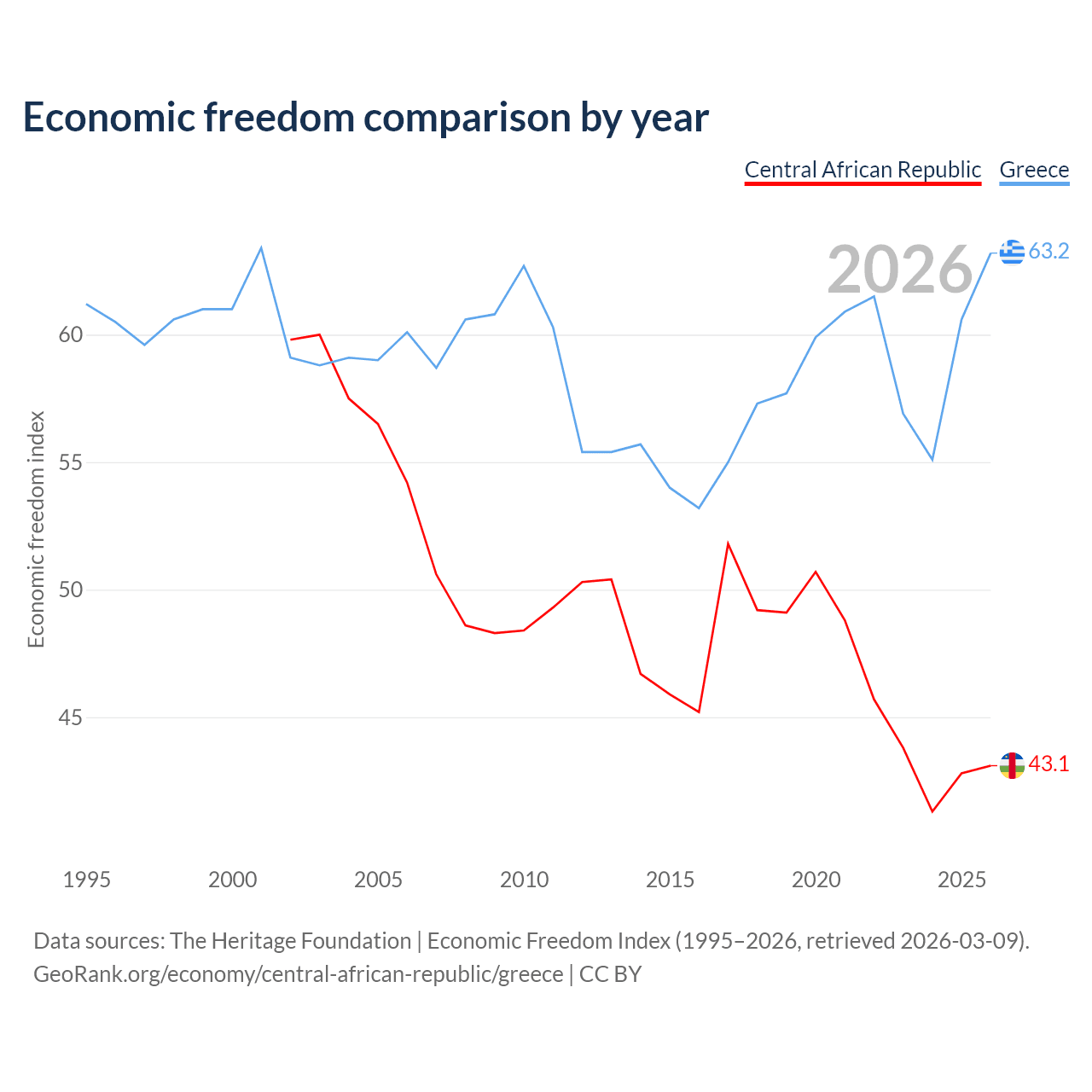 The Economic Freedom Index for the Central African Republic is 43.1, ranking 182/197, compared to 63.2 for Greece, ranking 82/197. The chart above displays a comparison of annual changes in economic freedom indexes.