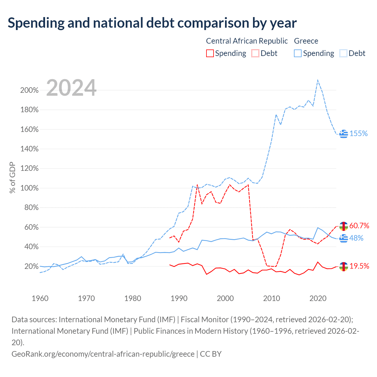 The Central African Republic has $1.67B in government debt (60.7% of GDP), compared to $397B (154.8% of GDP) in Greece.