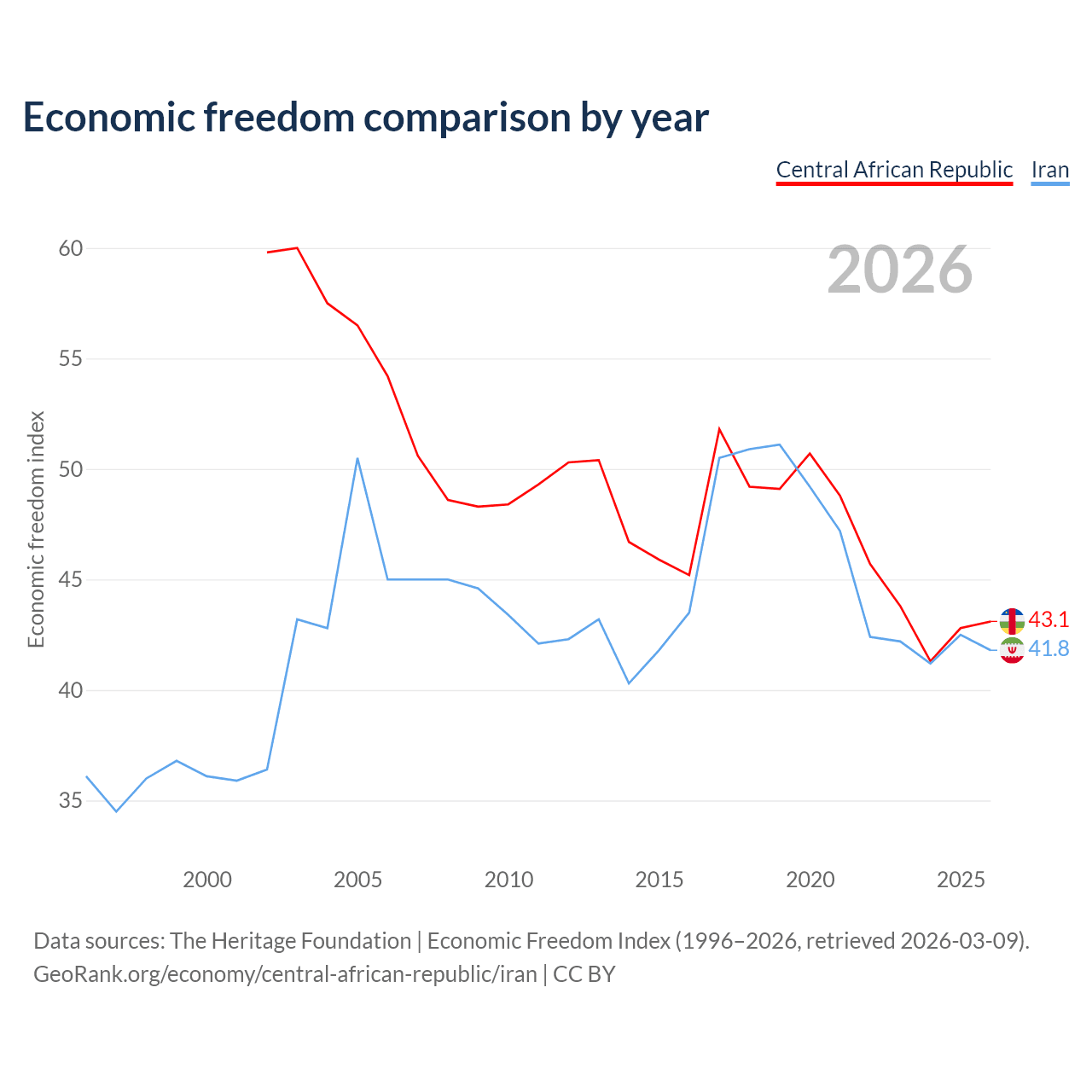 The Economic Freedom Index for the Central African Republic is 43.1, ranking 182/197, compared to 41.8 for Iran, ranking 185/197. The chart above displays a comparison of annual changes in economic freedom indexes.
