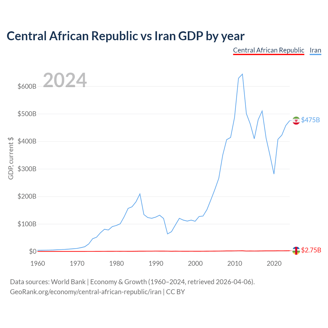 The Central African Republic has a GDP of $2.75B compared to $475B for Iran, ranking 171/197 and 34/197 by economy size, respectively.