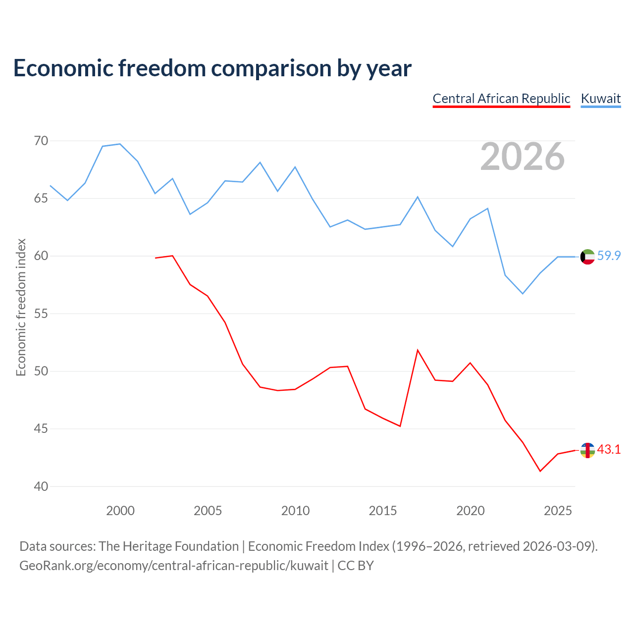 The Economic Freedom Index for the Central African Republic is 43.1, ranking 182/197, compared to 59.9 for Kuwait, ranking 100/197. The chart above displays a comparison of annual changes in economic freedom indexes.