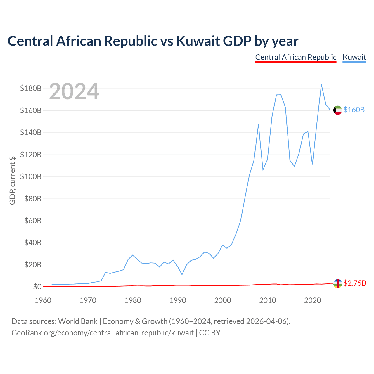 The Central African Republic has a GDP of $2.75B compared to $160B for Kuwait, ranking 171/197 and 59/197 by economy size, respectively.