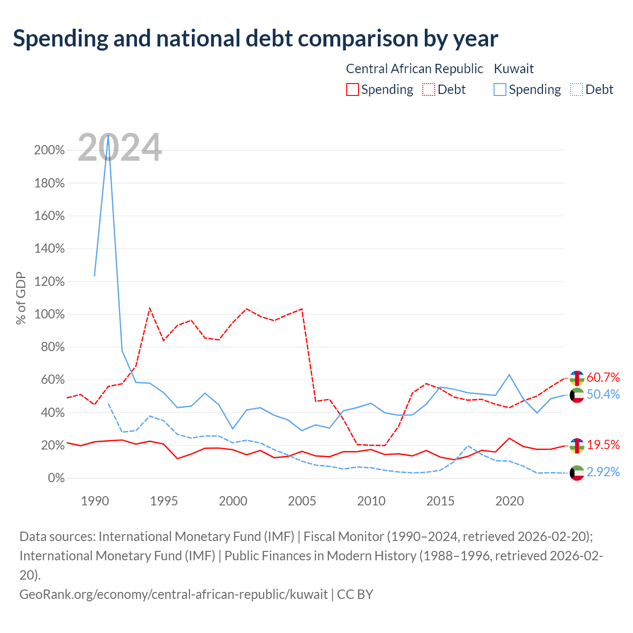 The Central African Republic has $1.67B in government debt (60.7% of GDP), compared to $4.68B (2.92% of GDP) in Kuwait.