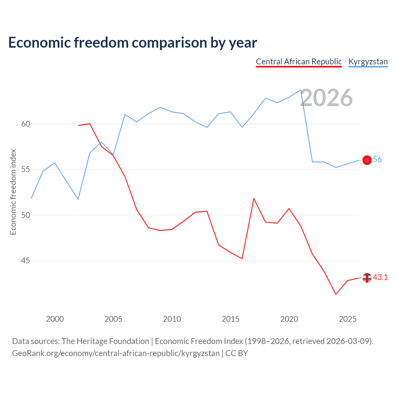 The Economic Freedom Index for the Central African Republic is 43.1, ranking 182/197, compared to 56 for Kyrgyzstan, ranking 126/197. The chart above displays a comparison of annual changes in economic freedom indexes.